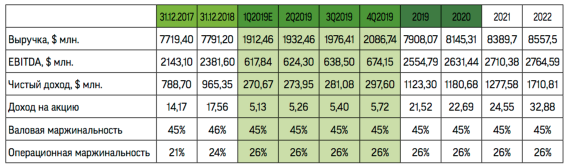 Сегмент Epsilon Alliance Data System купила в 2004 году за $300 млн с целью диверсификации выручки. В 2014‐м этот сегмент был расширен за счет поглощения компании Conversant за $2,3 млрд. В начале апреля стало известно, что французская маркетинговая фирма Publicis ведет переговоры о покупке этого направления, которое на сегодня оценивается в $5 млрд. Если сделка состоится, она позитивно повлияет на финансовое состояние Alliance Data System. Во‐первых, компания сможет увеличить программу buy back на $1–2 млрд с нынеш‐ них $222 млн. Во‐вторых, за прошлый год Alliance Data System заплатила менее $500 млн в виде дивиденда. После продажи своего маркетингового бизнеса она сможет повысить эти выплаты до $550 млн и $610 млн в 2020‐м и 2021 году соответственно. В случае продолжения обратного выкупа акций дивидендная доходность в ближайшие три года может увеличиться до 3% с учетом нашей целевой цены.