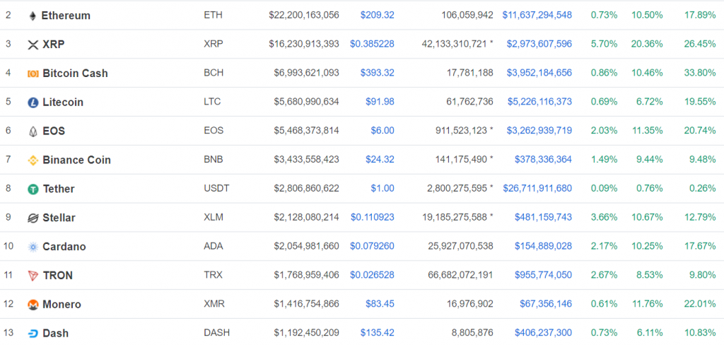 Кроме этого, отметим уверенный рост Ethereum и XRP. Вторая по капитализации криптовалюта выросла за сутки в цене на 10,5% и сейчас торгуется в районе $210, токен XRP за этот же временной отрезок вырос более чем на 20%, добравшись до $0,385.