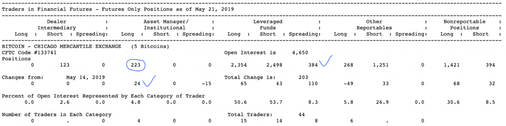 Обращаясь к COT-отчетам, мы отчетливо видим, что институционалы (Asset Managers) уверенно удерживают свои лонг-позиции, увеличив с 14 мая общий объем еще на 12%. При этом они полностью закрыли хеджевые позиции (о чем говорит закрытие 15 контрактов в разделе спрединга). Для биткоин-оптимистов это зеленый свет.