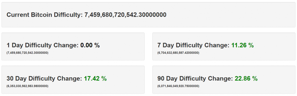 В результате очередного перерасчета сложность майнинга биткоина поднялась до нового исторического максимума, достигнув показателя в 7,459 T.