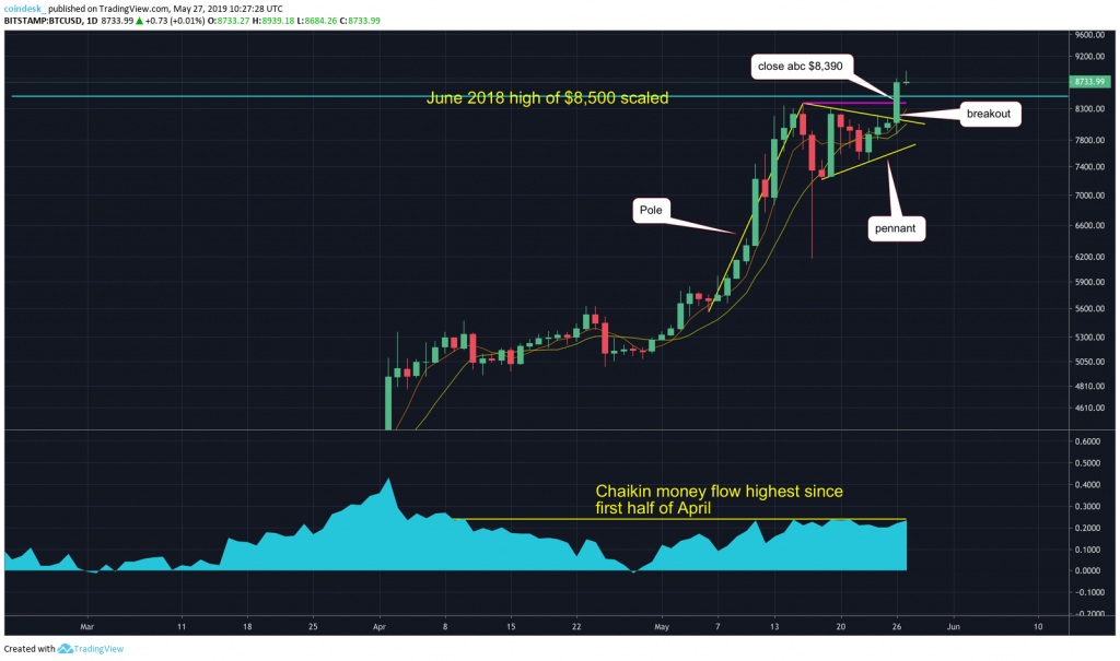 Аналитик CoinDesk Markets Омкар Годбоул прогнозирует, что BTC вскоре протестирует отметку в $10 000. На графике ниже отчетливо видно, как цена пробивает верхнюю границу паттерна «Вымпел», что говорит о весьма вероятном дальнейшем росте. Любая коррекция будет непродолжительной, поскольку давление покупателей слишком велико (о чем свидетельствуют и значения индикатора «Денежный поток Чайкина»).