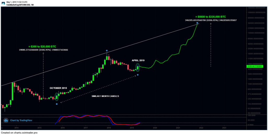 Дальше в своих прогнозах пошел популярный в Twitter теханалитик Galaxy — он ждет от биткоина роста до $330 000. Эксперт также ссылается на паттерн на графике, повторяющий ситуацию 2015 года, считая, что история повторится. Если рынок сохранит текущую динамику, то этой цены BTC может достигнуть уже к концу 2021 года.