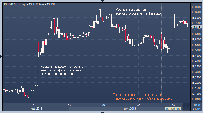 Курс USDMXN этой ночью рванул вверх и теперь держится неподалеку от локальных максимумов, куда его отправили новости о решении Трампа ввести новые пошлины в отношении товаров из Мексики. Катализатором движения вновь стал твиттер президента США, в котором он сообщил, что первый день переговоров с Мексикой не принес результата.