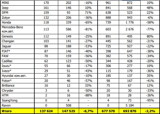 Продажи новых легковых и легких коммерческих автомобилей в России по маркам авто. Данные включают как импортированные, так и автомобили отечественной сборки. Сортировка в таблице по результатам продаж за месяц.