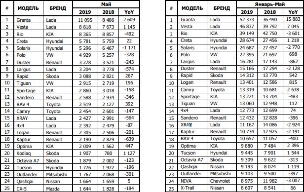 В России продажи новых легковых и легких коммерческих автомобилей в мае 2019 г. сократились на 6.7% (9 901 единиц) к маю 2018 г. и составили 137 624 штук, сообщила Ассоциация европейского бизнеса (АЕБ). Все машины из ТОП-10 продаж местного производства.