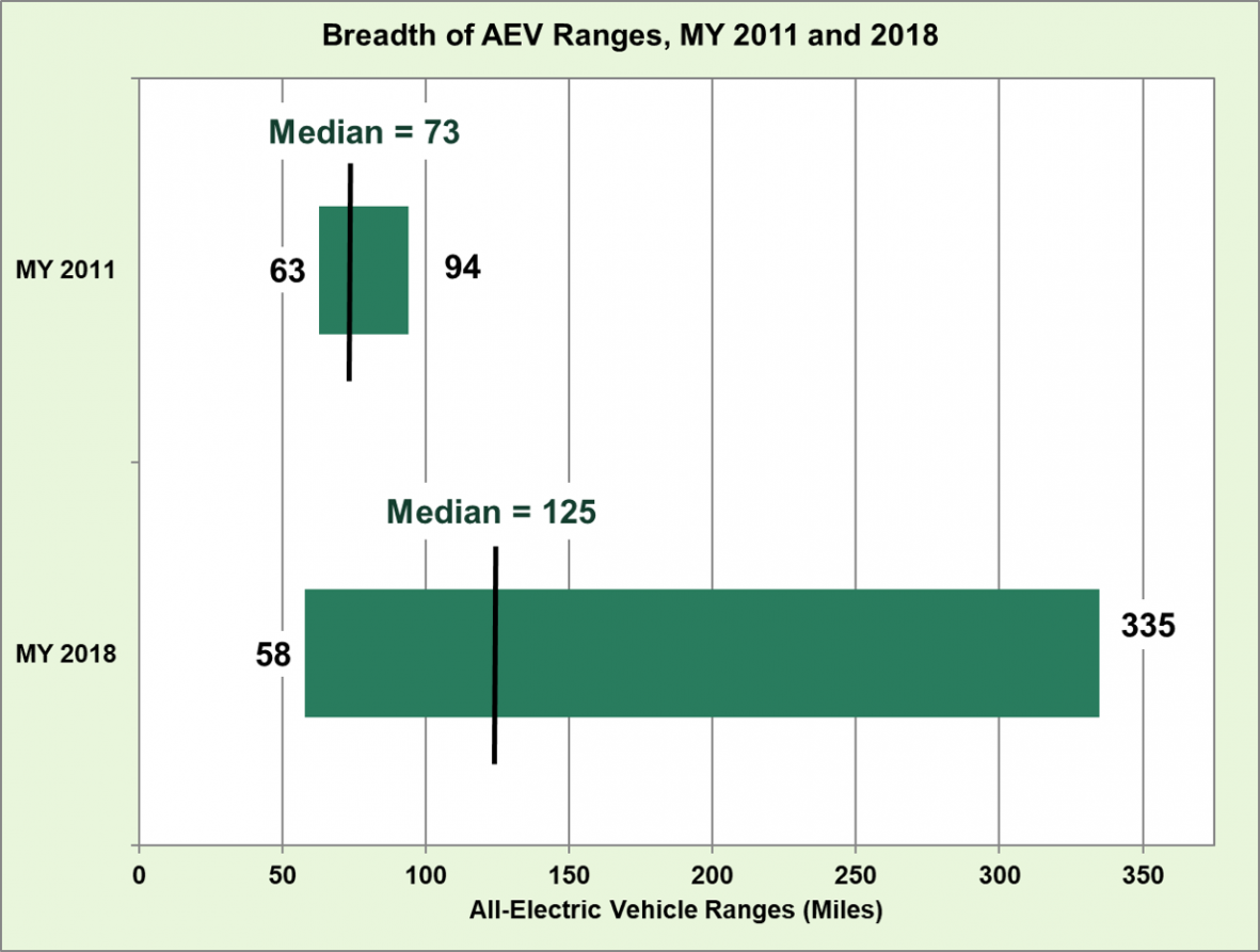 Средний пробег чистого электромобиля на одном заряде вырос с 73 миль в 2011 до 125 миль в 2018.