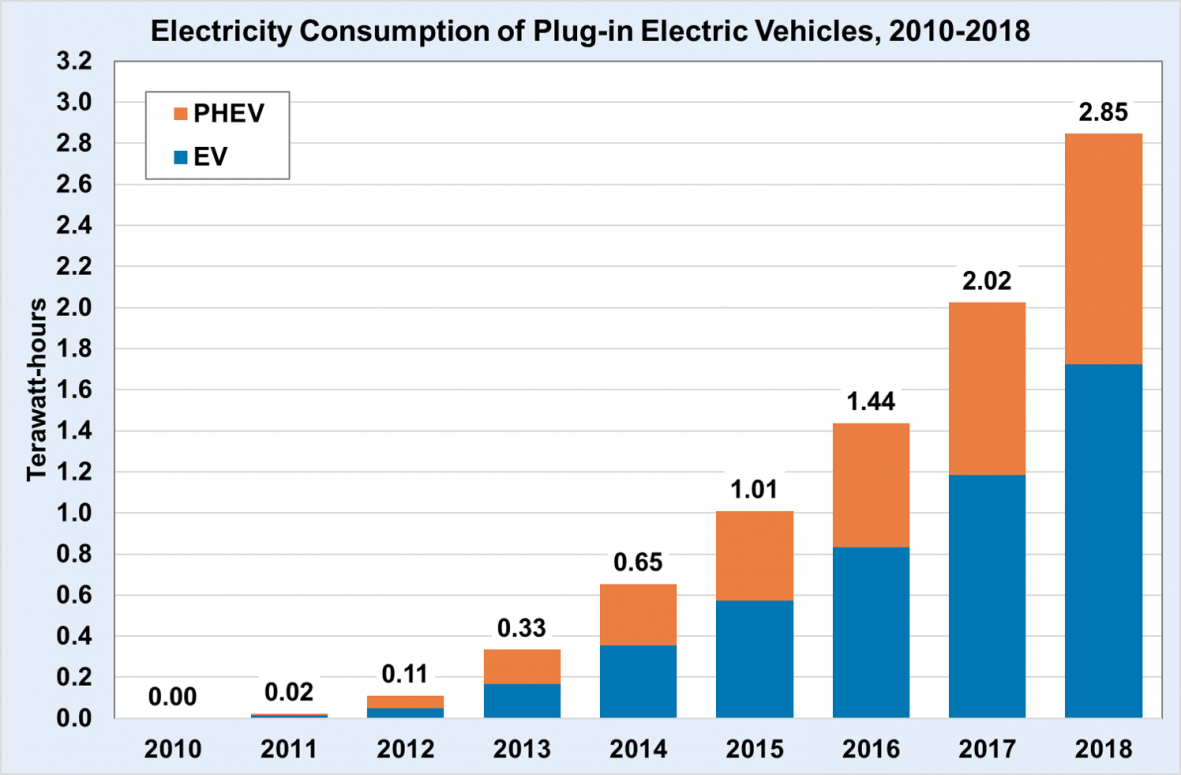Потребление электроэнергии электрокарами с 2016 года почти удвоилось и в 2018 году составило 2,85 тераватт-часов (около 0,07% общего потребления э/э).