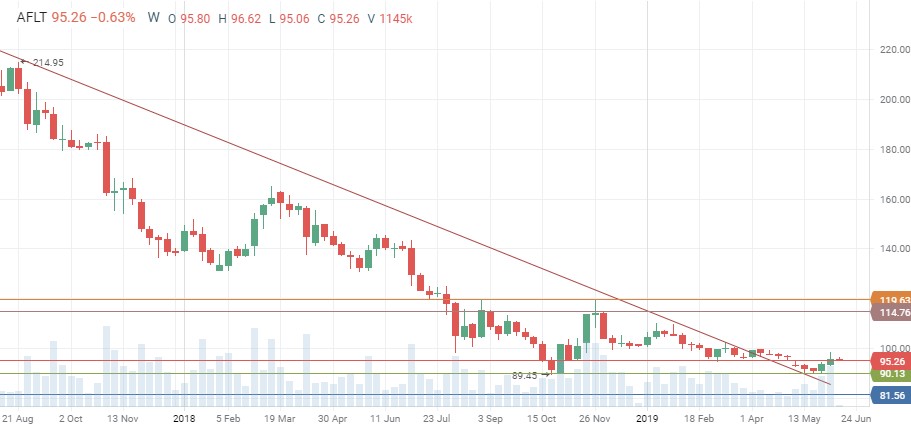 На недельном графике акции Аэрофлота консолидируются в районе локальных минимумов. Поддержкой выступает диапазон 90-95, сопротивление пролегает в районе 115-120.