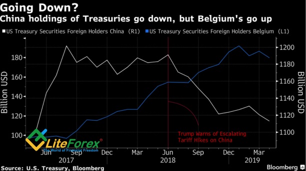 Рынки не верят в ослабление денежно-кредитной политики на заседании 18-19 июня, однако искренне рассчитывают, что Федрезерв укажет, при каких условиях оно может произойти. Одним из них является дальнейшая эскалация торгового конфликта Вашингтона и Пекина в случае если Дональду Трампу и Си Цзиньпину не удастся встретиться в японской Осаке на саммите G20 или договориться. Торговые войны являются серьезным «медвежьим» драйвером для мировых фондовых индексов, в то время как слухи, что ФРС будет на них реагировать снижением ставки поддерживают «быков» по S&P 500. США и Китай разделяет пропасть, Белый дом намерен обложить пошлинами весь импорт Поднебесной, Пекин отвечает снижением запасов трежерис до двухлетнего минимума в $1,11 трлн. Показатель падает 8-й месяц подряд, что дает повод для слухов, что таким образом Китай хочет поднять доходность американских облигаций и усложнить Штатам жизнь в области обслуживания долга. На самом деле, подобные действия могут принести серьезную боль и самой Поднебесной, к тому же есть информация, что она скупает долговые обязательства США чужими руками. Через Бельгию.