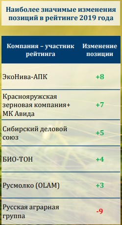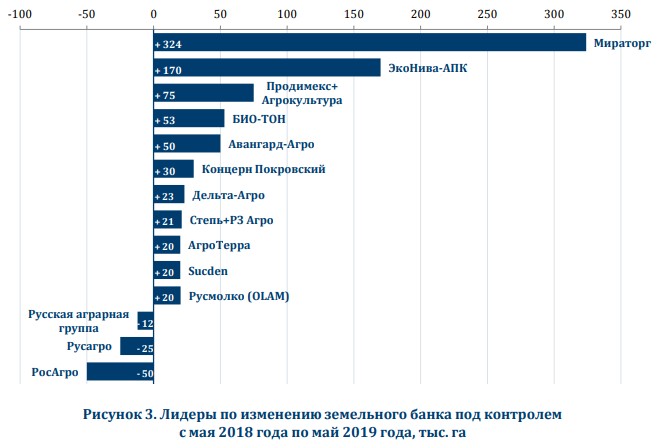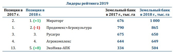 В рейтинге по итогам 2018 года 56 компаний, 44 из которых контролируют (владеют на праве собственности, аренды или ином законном праве) более 100 тыс. га сельхозугодий, а 12 компаний имеют под контролем около 100 тыс. га и располагаются на условной 45-й строке рейтинга. Объем земельного банка пятерки лидеров составляет 27 % от общего объема земли в рейтинге. Впервые за пять лет лидер рейтинга Продимекс ушел с первой позиции, уступив Мираторгу, у которого на момент публикации рейтинга 1 млн га земли под контролем. На третьем и четвертом местах, как и в прошлом году, Русагро и Агрокомплекс. Русагро держит позицию, даже несмотря на то, что в этом году земельный банк группы меньше на 25 тыс. га. Уменьшение было вызвано оптимизацией земельных активов и продажей неэффективных земель. В рейтинге текущего года не учитывается планируемое получение ГК "Русагро" земельных активов вследствие поглощения холдинга "Солнечные продукты", которое должно завершиться в 2019 году. Участник на пятой позиции рейтинга традиционно меняется практически ежегодно, и на май 2019 года ее занял агрохолдинг "ЭкоНива-АПК", который за год прибавил 170 тыс. га. Это одно из самых значительных расширений земельного банка среди участников рейтинга в 2018 году, а также наиболее значительное изменение позиции рейтинга.
