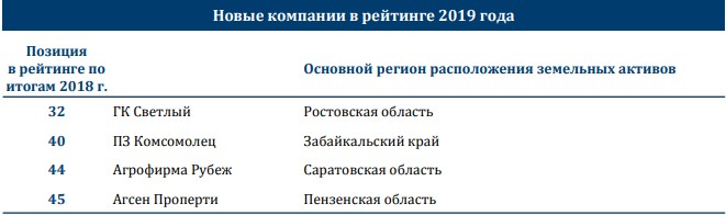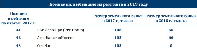 Три компании выбыли из рейтинга в 2019 году в силу уменьшения земельного банка. У татарской СетИле на данный момент нет земли под контролем, у нижегородской АгроКапиталИнвест в этом году 60??тыс. га, а РАВ Агро-Про, подконтрольная PPF Group, по последним подсчетам BEFL, владеет 66 тыс. га.