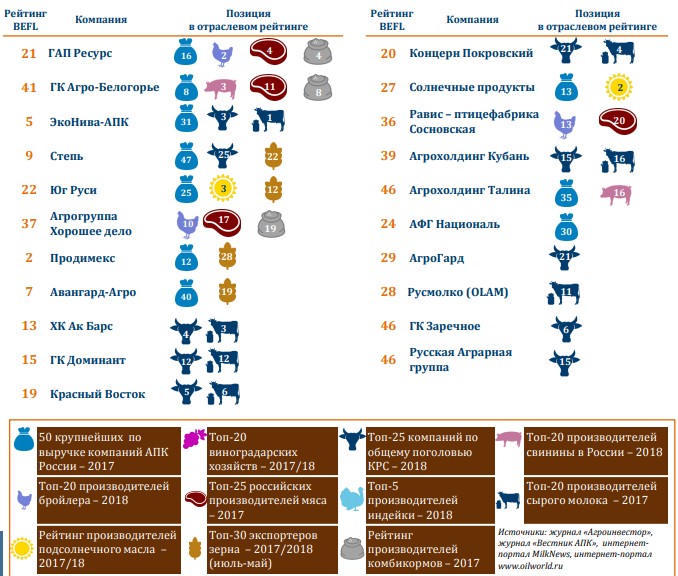 Прочие компании имеют топовые позиции в четырех и менее отраслевых рейтингах (см. таблицу ниже). Таким образом, в рейтинге BEFL: o 15 компаний входят в Топ-50 крупнейших компаний АПК России по выручке по итогам 2017 года; o 13 компаний входят в Топ-25 компаний по общему поголовью КРС по итогам 2018 года; o 11 компаний входят в Топ-25 российских производителей мяса по итогам 2017 года; o 10 компаний входят в Топ-20 производителей комбикормов по итогам 2017 года; o 9 компаний входят в Топ-20 крупнейших производителей сырого молока в России по итогам 2017 года; o 7 компаний входят в Топ-20 производителей бройлера по итогам 2018 года; o 6 компаний входят в Топ-20 крупнейших производителей свинины в России по итогам 2018 года; o 4 компании входят в Топ-30 экспортеров российского зерна в сезоне 2017-2018 гг.; o 3 компании входят в Топ-10 производителей подсолнечного масла за 2017/2018 гг.; o 1 компания входит в Топ-5 производителей индейки по итогам 2018 года; o 1 компания входит в Топ-20 крупнейших виноградарских хозяйств РФ на конец 2017 - начало 2018 года.