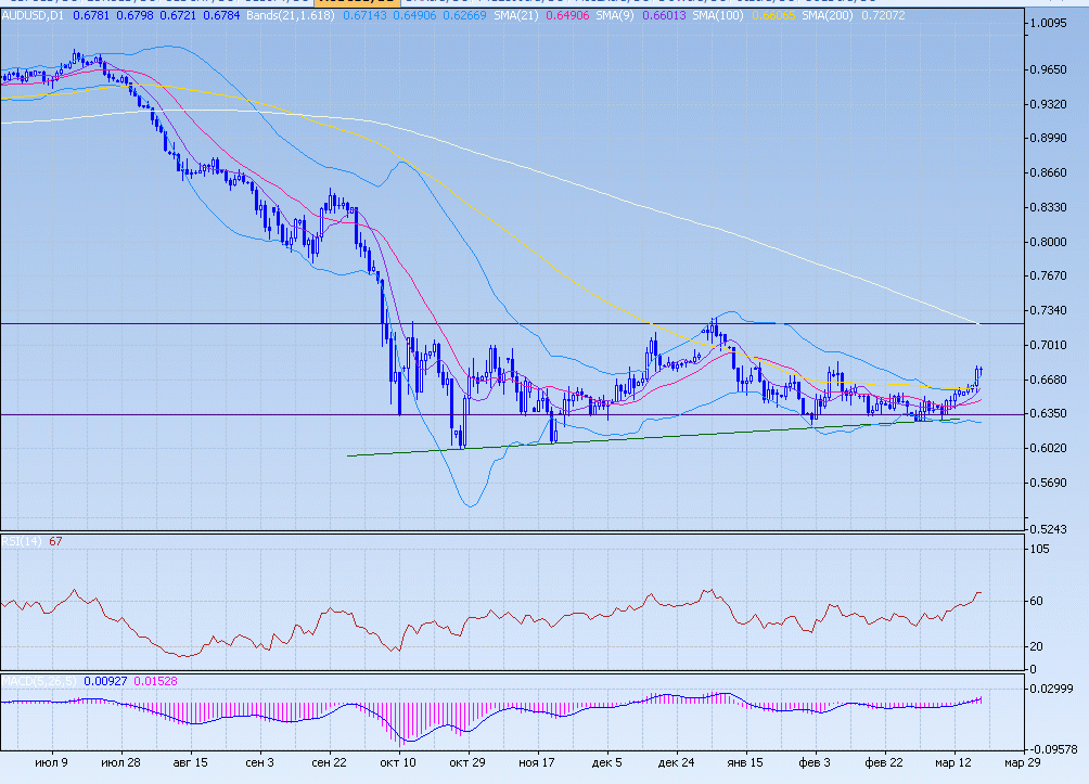 Аусси вырос, пробив серию сопротивлений. Сопротивление росту оказывают отметки в районе 0,6820. В случае пробоя этой отметки вверх аусси продолжит рост. В противном случае он откатится. В целом пара продолжает консолидироваться в широком диапазоне в рамках долгосрочной модели восходящего треугольника в основании.