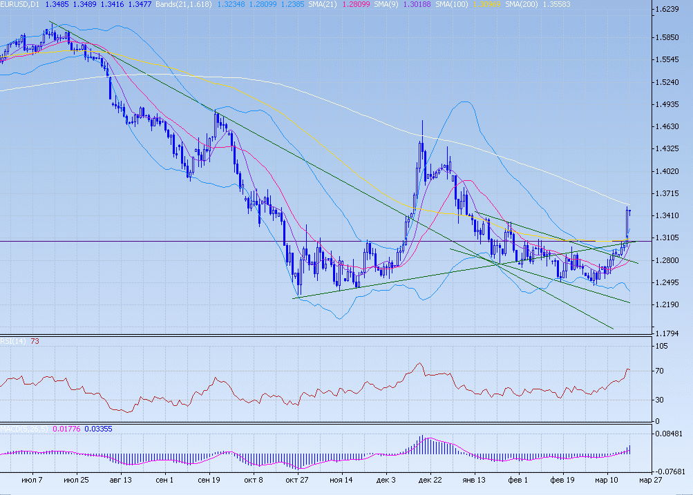Вы сами все видели добавить нечего. Прорыв отметки 1,3060 стал сильным сигналом к росту евро. Евро резко вырос на избыточном количестве денег США, достигнув целевой отметки после прорыва канала. Моментум евро к росту довольно сильный ожидаем продолжения роста по направлению к 1,3740 в ближайшие сессии. Торговля будет сопровождаться резкими разнонаправленными движениями.