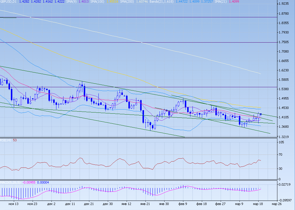 Стерлинг снижался, от падения его сдержала поддержка на 1,3850. Комментарии FOMC вызвали бурную реакцию на рынке, и стерлинг вырос под понижательное сопротивление, проходящее по 1,4280. Прорыв этого сопротивления станет сильным сигналом к продолжению роста стерлинга. Сильные поддержки сосредоточены в районе 1,4095 и на 1,3850. Текущая сессия, вероятно будет сопровождаться резкими разнонаправленными движениями.
