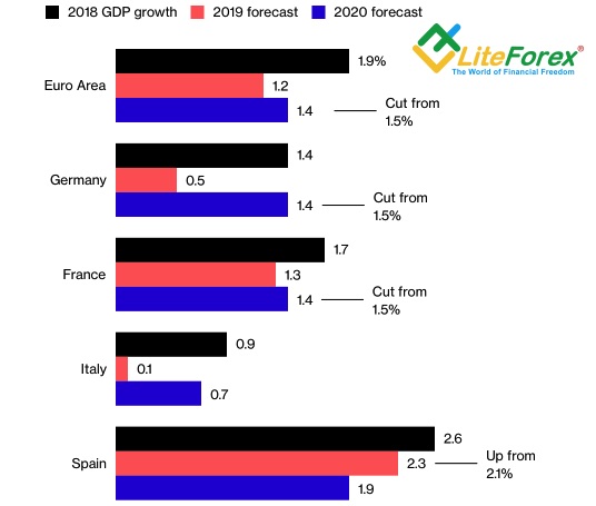 Похоже, Forex вступает в новый этап валютных войн. Инвесторы воспринимают снижение ставки ФРС как превентивную меру по образцу 1995 и 1998, когда, несмотря на силу экономики США, центробанк прибегнул к монетарной экспансии и уберег Штаты от рецессии. Он ослабил денежно-кредитную политику в 2001 и 2007, когда негатив уже начал проявляться, однако по факту все обернулось спадом. Желание действовать на опережение похвально, однако неужели Федрезерв думает, что только он такой умный? ЕЦБ также готов снизить ставки и реанимировать QE, и нужно признать, что оснований для этого у Франкфурта гораздо больше, чем у Вашингтона. Взять хотя бы ухудшение прогнозов ЕС по ВВП и инфляции на 2020 и заявления немецких политиков о том, что Европейскому союзу нужно готовиться к торговой войне с США по всем фронтам.