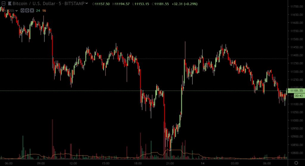 На каком-то этапе цена биткоина снова поднялась вплотную к $11 500, однако впоследствии скорректировалась. На момент публикации BTC торгуется в районе $11 180.