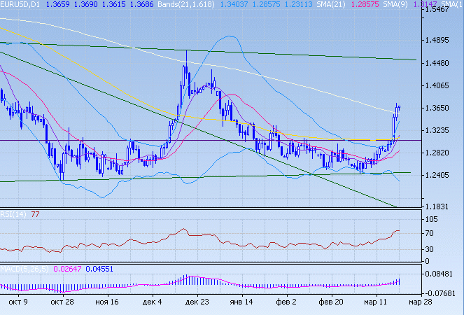 Евро продолжил рост. Импульс к росту по-прежнему сильный, тем не менее, вероятна консолидация после чего рост продолжится. Сильное сопротивление при росте евро встретит на 1,3850 и в районе 1,3900. Поддержку оказывают отметки на 1,3640, преодоление этой отметки приведет к краткосрочной коррекции вниз.