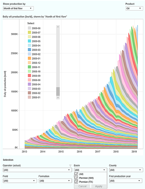 График суббассейнов Делавэр и Мидленд в Пермском бассейне (Техас и Нью-Мексико) с 2008 г. по март 2019 г,, показывающий снижение добычи нефти от месяца к месяцу.