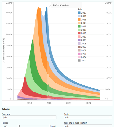 Как видно из графика, продуктивность скважин в суббассейнах Делавэр и Мидленд Пермского бассейна неуклонно улучшалась с 2013 г. Шестьдесят семь процентов (67%) от 3,2 млн. б/д Пермского бассейна теперь добывается из 4832 скважин, которые были введены в эксплуатацию в 2018 г. Оставшиеся 1,056 млн. б/д нетрадиционной нефти в Пермском бассейне поступают из 16548 горизонтальных скважин, пробуренных с 2009 г. В среднем на этих скважинах добывается 64 б/д. Необратимый спад делает добычу менее 50 б/д на скважину.