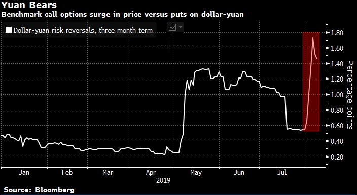 Последняя угроза Трампа снова увеличить тарифы на китайские товары помогла юаню преодолеть психологический порог в 7, уровень, который власти защищали в прошлом. Юань вырос по отношению к доллару в четверг после того, как центральный банк установил ежедневную фиксацию сильнее, чем ожидали аналитики, предоставляя некоторую уверенность трейдерам, потрясенным бурной неделей на рынках. Nordea Bank Abp повысил прогноз по доллару в четверг, сославшись на такие факторы, как «эскалация тарифной войны». Трейдеры опционов на этой неделе заплатили повышенную плату, чтобы сделать ставку на падение юаня в ближайшие три месяца, согласно ценам валютных опционов.