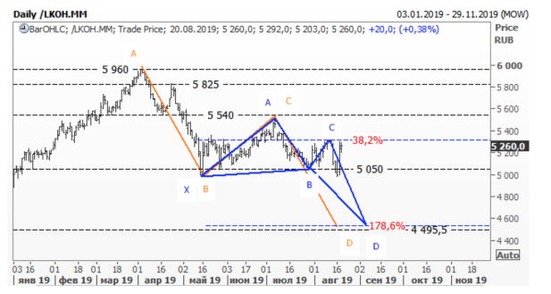 Ранее, в своих обзорах, мы не один раз обращали внимание на текущую конструкцию графика (речь идет о паттерне «ABCD» и его второй ноги, принявшей, на наш взгляд пропорции гармонической модели), согласно которой котировки нефтегазовой компании способны опуститься до 4 500 руб. и ниже.