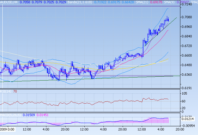 В текущую сессию ожидаем консолидации, снижения аусси к линии тренда. Цель: 0,7000