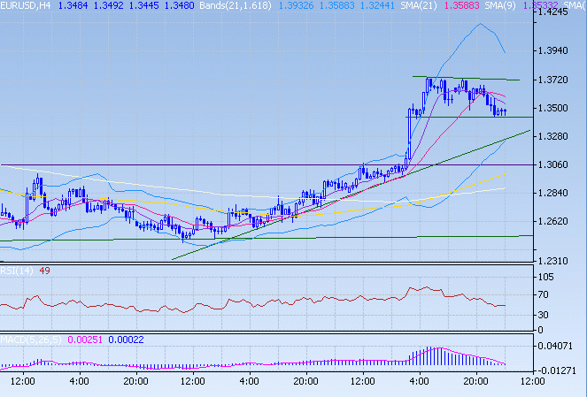 Модель треугольника далее не рассматриваем. Евро снизился к поддержке на 1,3430. Торговля ведется в диапазоне 1,3740-1,3430. Пара, вероятно, продолжит консолидироваться в диапазоне. Высокая вероятность снижения евро к повышательной поддержке, от которой начнется восстановление, и рост евро продолжится. Пересечение скользящих средних порядка 9 и 21 на четырехчасовом графике не в пользу евро.