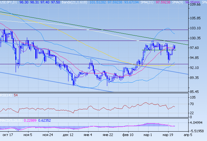 В текущую сессию ожидаем роста йены к поддержке на 97,05, затем роста доллара. Цель: 98,95/99,60