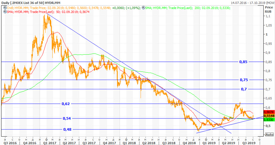 Мы повышаем рекомендацию с "держать" до "покупать" и целевую цену до 0,70 руб. на перспективу 18 месяцев. Вложения в акции РусГидро могут принести доход 26% без учета дивидендов. Полная доходность может составить 32%. На наш взгляд, коррекция после дивидендной отсечки является хорошей возможностью для формирования длинных позиций на долгосрочную перспективу. Для инвесторов текущие уровни мы считаем подходящими, поскольку улучшение по прибыли, денежному потоку и дивидендам в 2020 году должно привести к существенной положительной переоценке акций HYDR.