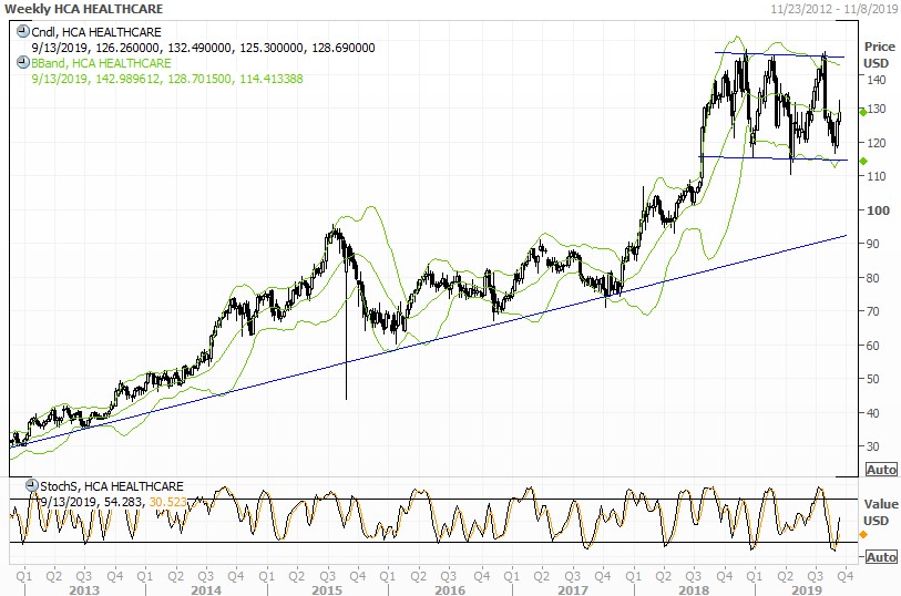 С технической точки зрения, на недельном графике HCA сохраняется устойчивый восходящий тренд, при этом формируется консолидационная фигура "прямоугольник", после которой есть вероятность нового витка роста цены.