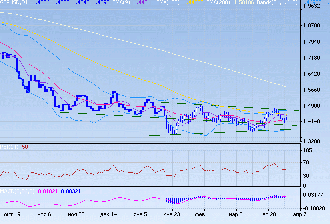 Стерлинг удерживается по поддержке – 21 дневной скользящей средней. Следующая поддержка проходит по 1,3980. Пара консолидировалась в середине полосы Боллинжера в верхней ее половине, что указывает на вероятность роста стерлинга в краткосрочной перспективе. Сопротивление будут оказывать отметки на 1,4430/65.и далее в районе 1,4730.