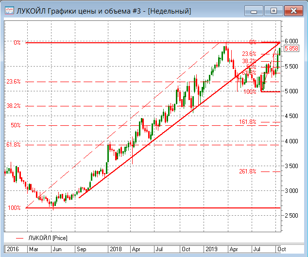 После объявления ЛУКОЙЛом о начале – с 1 октября 2019 года обратного выкупа акций Компании на открытом рынке, в том числе в форме депозитарных расписок, на общую сумму до $3 млрд. акции компании показали бурный рост цены. В настоящее время рекомендация от 1 октября о покупке акций по ценам 5561 и продаже по 5850 должна была успешно реализоваться. В настоящее время цены акций перевалили за указанную целевую отметку 5850 рублей за акцию. На волне такого мощного импульса вверх, вполне возможно, что цены акций еще смогут двинуться выше. Если это произойдет в ближайшие дни, то тогда на рынке возникнет благоприятная ситуация для локальных продаж акций. Действительно, на подступах к 5950 у цен акций находится очень сильное сопротивление, сформированное как предыдущим максимумом текущего года, так и границей очень длительного восходящего тренда, которая была пробита вниз в текущем году на фоне окончания предыдущей программы выкупа акций.