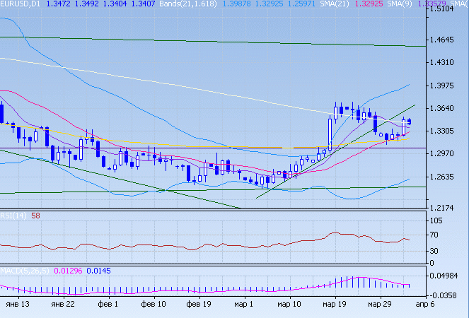 Евро вырос, найдя сопротивление на 1,3470. Преодоление этой отметки вызовет рост под повышательную линию сопротивления в районе 1,3660, выступающую ранее линией тренда. Поддержку оказывает 21-дневная скользящая средняя, отметки на 1,3190. Ожидаем возможного развития восходящей тенденции, прорыв 1,3740 станет в этом отношении важным сигналом.