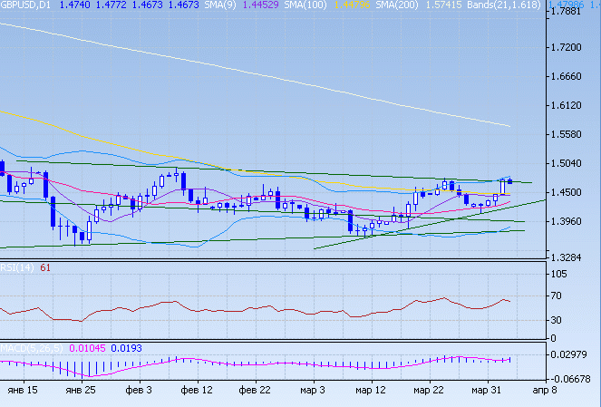 Стерлинг вырос под сопротивление в районе 1,4770.затем несколько снизился. Если стерлингу удастся удержаться выше 1,4665 рост продолжится к отметке 1,4865/1,4965. В противном случае последует снижение к нижним уровням. Верхняя граница полосы Боллинжера окажет сильное сопротивление при росте стерлинга.
