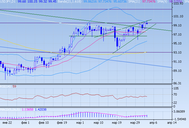 Доллар вырос в этой паре. Пара тестировала сильное сопротивление в районе 99,60 и верхнюю границу полосы Боллинжера. Довольно сильная область сопротивлений 99,60-100,20. Ее прорыв сместит торговлю в верхний ценовой диапазон и станет сигналом к развитию восходящей тенденции. Вероятно пара ненадолго задержится на текущих уровнях после чего последует тестирование сопротивлений и рост доллара продолжится. Первоначальной отметкой станет 102,70