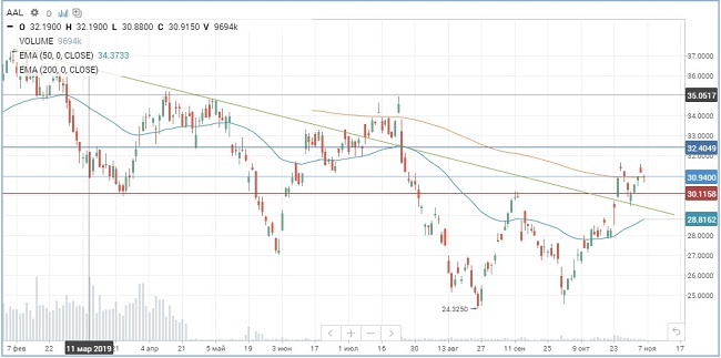 Акции компании продолжают находиться на своих долгосрочных минимальных значениях. При этом, преодолев уровень цены 32 $ снизу вверх, у акций открывается горизонт к существенному росту. При покупке на 10,6% с выставлением стоп-заявки на отметке 29,50 $ риск на портфель составит 0,5%. Соотношение прибыли к риску - 4.