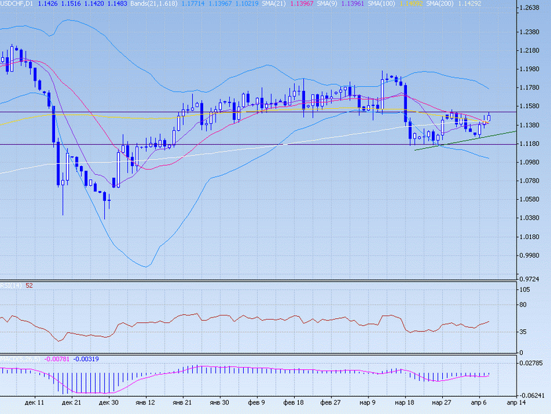 Доллар вырос под горизонтальное сопротивление на 1,1525. Наблюдаем пересечение 9-дневной и 21-дневной скользящих средних в сторону роста доллара. В сторону вероятного роста доллара указывает также сформированная краткосрочная повышательная линия тренда. Прорыв 1,1525 приведет к развитию восходящей для доллара тенденции. В противном случае торговля в диапазоне 1,1525-1,1175 продолжится.
