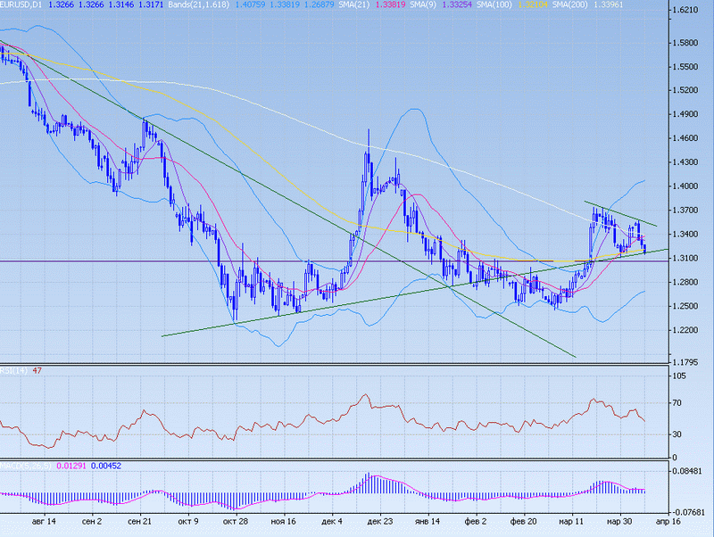 Евро снижался, сильную поддержку оказывает среднесрочная повышательная поддержка, проходящая в районе 1,3160. Ее преодоление приведет к снижению евро отметке 1,3060, где проходит горизонтальная поддержка. Краткосрочные индикаторы RSI перепроданы, что удержит евро от значительного снижения. Сопротивление теперь будут оказывать скользящие средние.