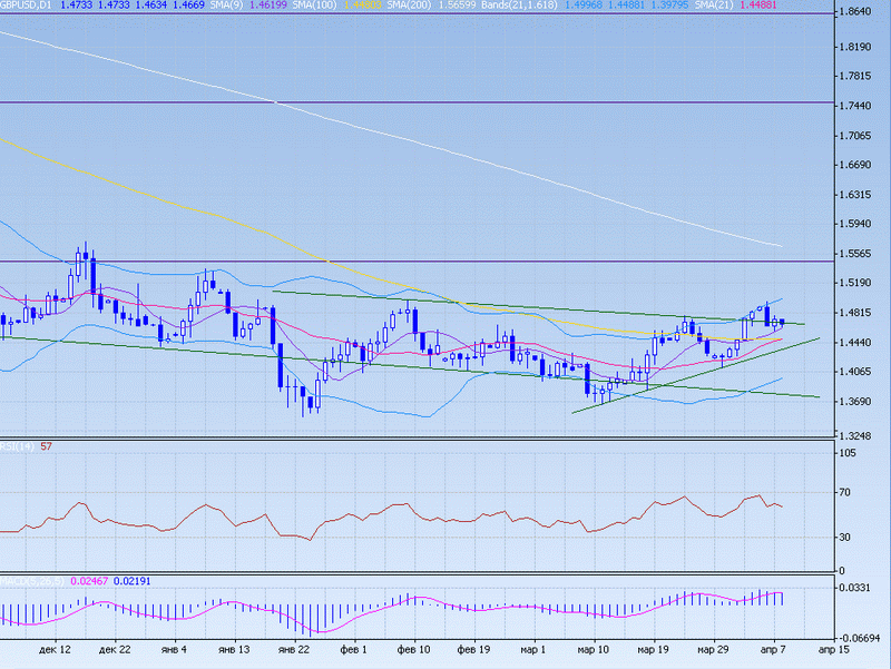Пара консолидируется по понижательной поддержке в районе 1,4665. Стерлингу не удалось вырасти, вероятно он продолжит снижаться к краткосрочной повышательной поддержке проходящей в районе 1,4365. Поддержку будут оказывать также 9-дневная и 21-дневная скользящие средние. Тем не менее, если 9-дневная средняя не будет преодолена, стерлинг подрастет.