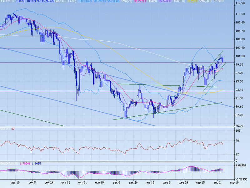 Йена продолжила рост, достигнув поддержки (по графику) на 99,60. Вероятно дальнейшее развитие нисходящего движения, сильную поддержку доллару окажут отметки в районе 98,80-60. До тех пор пока пара продолжает торговаться в повышательном канале, доллар имеет потенциал к росту.