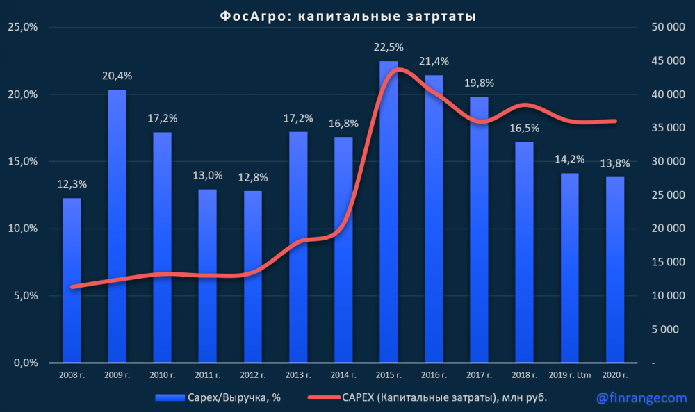 По словам главы компании Андрея Гурьева, ФосАгро планирует снизить или как минимум сохранить объём капитальных затрат в 2020 г. «Общий объем капвложений в развитие производственных мощностей без учета капитализированных ремонтов в 2020 г. не превысит уровень 2019 г. - 36 млрд руб.», - сказал он.