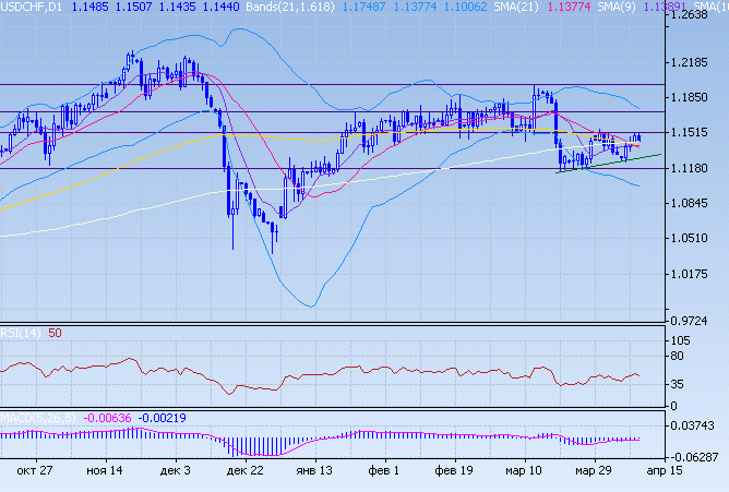 Сильное сопротивление на 1,1525 не позволило доллару вырасти, и он откатился. Скопление скользящих средних в области 1,1435-1,1375 окажут доллару значительную поддержку. Преодоление этой серии поддержек приведет к росту свисси первоначально к краткосрочной повышательной линии тренда проходящей по 1,1275 и далее к сильной поддержке на 1,1175. В случае роста доллара прорыв 1,1525 даст сильный сигнал к развитию восходящей тенденции для доллара и смещению торговли в верхний ценовой диапазон. Торговля ведется в диапазоне 1,1525-1,1175.