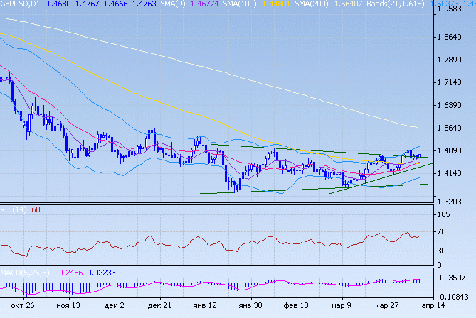 Пара продолжает консолидироваться в районе 1,4700, где сосредоточена серия поддержек. Торговля ведется по понижательной поддержке с началом 08.02.2009 и 9-дневной скользящей средней. Прорыв понижательной поддержки приведет к снижению стерлинга к краткосрочной линии тренда, проходящей по 1,4365. До сих пор снижения стерлинга не происходило, индикаторы более не перекуплены, что указывает на вероятность начала роста стерлинга. Сопротивление проходит по 1,4865, верхняя граница полосы Боллинжера, проходящая по 1,5037, также окажет сильное сопротивление при росте.