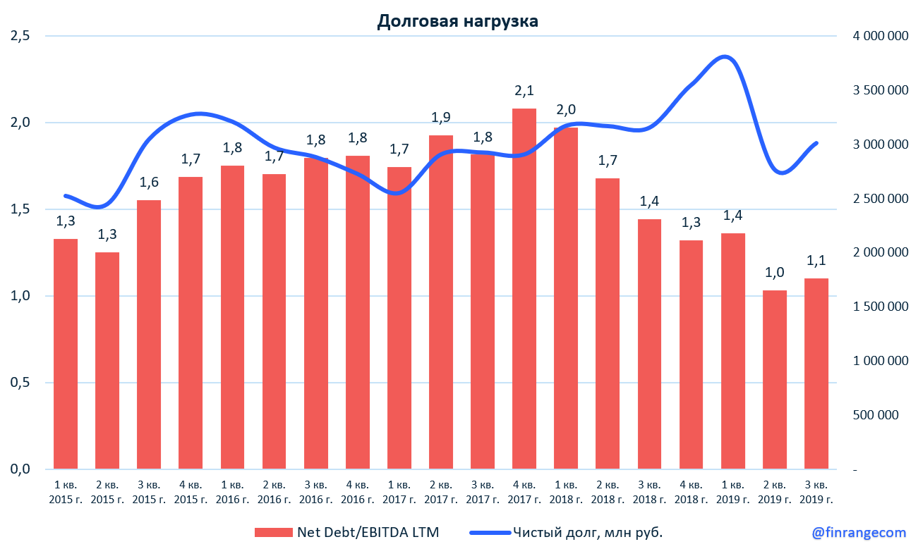 По итогам отчётного периода чистый долг компании увеличился из-за отрицательного денежного потока и рекордных выплат дивидендов в III кв. 2019 г. в размере 370 млрд руб. При этом, долговая нагрузка компании остаётся низкой, коэффициент чистый долг / EBITDA оценивается на уровне 1,1х. При этом прогнозы компании показывают, что в следующие годы долговая нагрузка не превысит 1,5х.