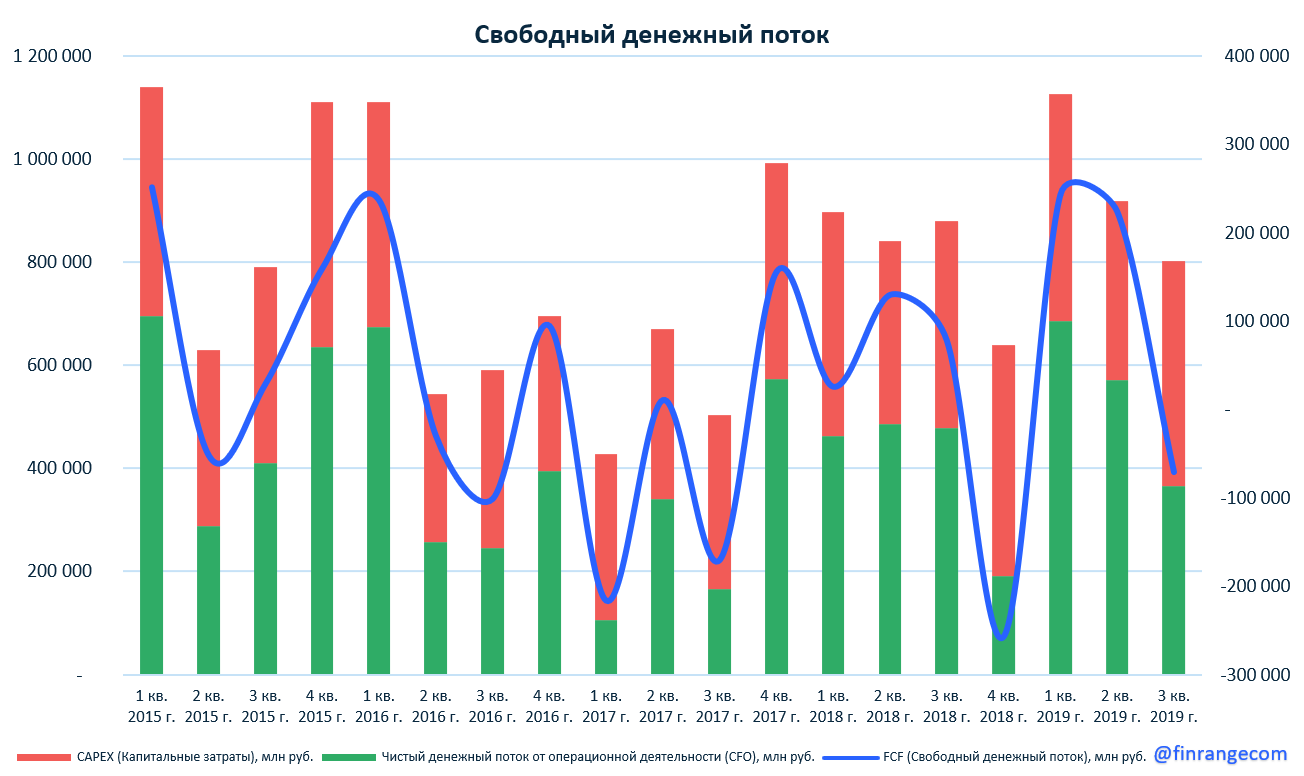 На фоне прохождения пика инвестиционного цикла объем капиталовложений в июле – сентябре 2019 г. увеличился на 9% по сравнению с III кв. 2018 г. Таким образом, за отчётный период свободный денежный поток компании ушёл в отрицательную зону, но по итогам 2019 г. Газпром выйдет в плюс.