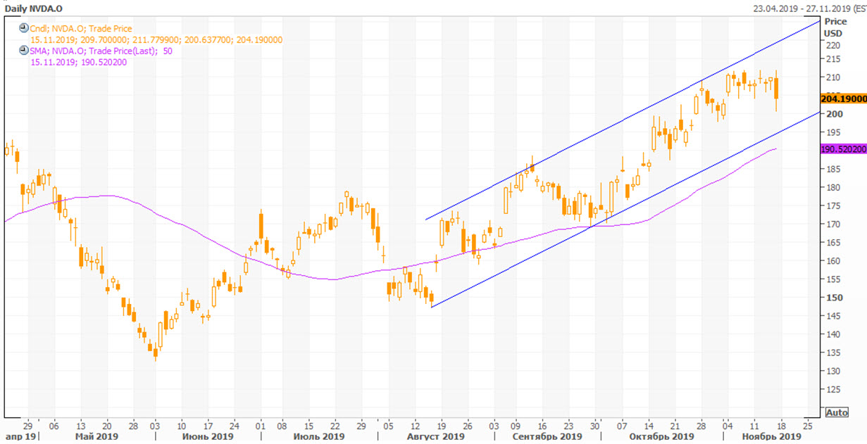 С точки зрения технического анализа на дневном графике акции NVIDIA движутся в рамках среднесрочного восходящего канала, выше 50-дневной скользящей средней. Ожидаем возобновления подъема к верхней границе канала, в район $225.