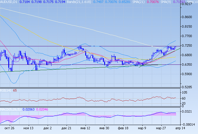 В текущую сессию ожидаем флэта, роста аусси. Цель: 0,7210/0,7280