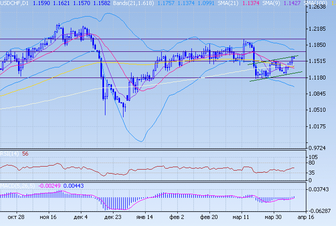 Доллару удалось преодолеть сопротивление на 1,1525, торговля сместилась в верхний ценовой диапазон. Пара торгуется в краткосрочном повышательном канале, и прорыв сопротивления канала позволит доллару развить успех. В противном случае шансы свисси вернуть утраченные позиции достаточно высоки. Пересечение 9-дневной и 21-дневной скользящих средних не в пользу свисси. Сессия пятницы проходит в отсутствии основных игроков и вероятно будет характеризоваться разнонапрвленной торговлей.