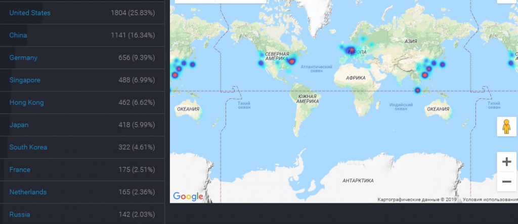 В США работает 2457 нод биткоина (25,74% от их общего числа), в Германии — 1906 (19,96%)